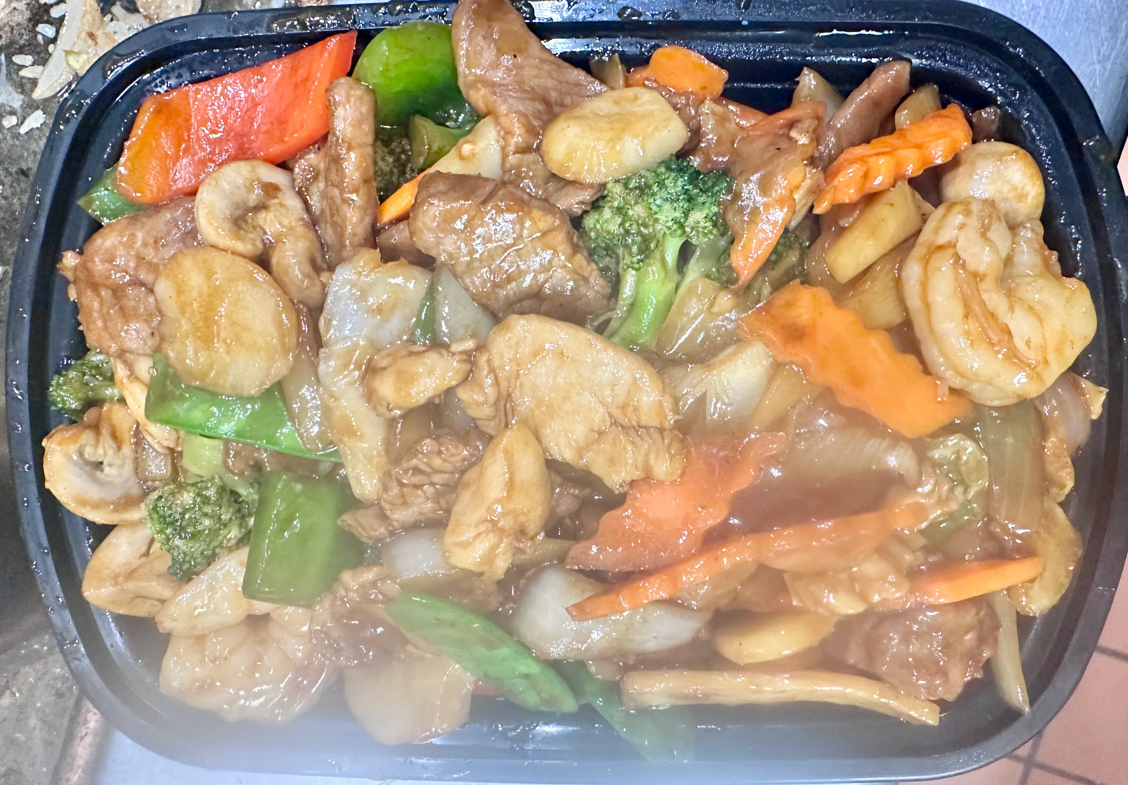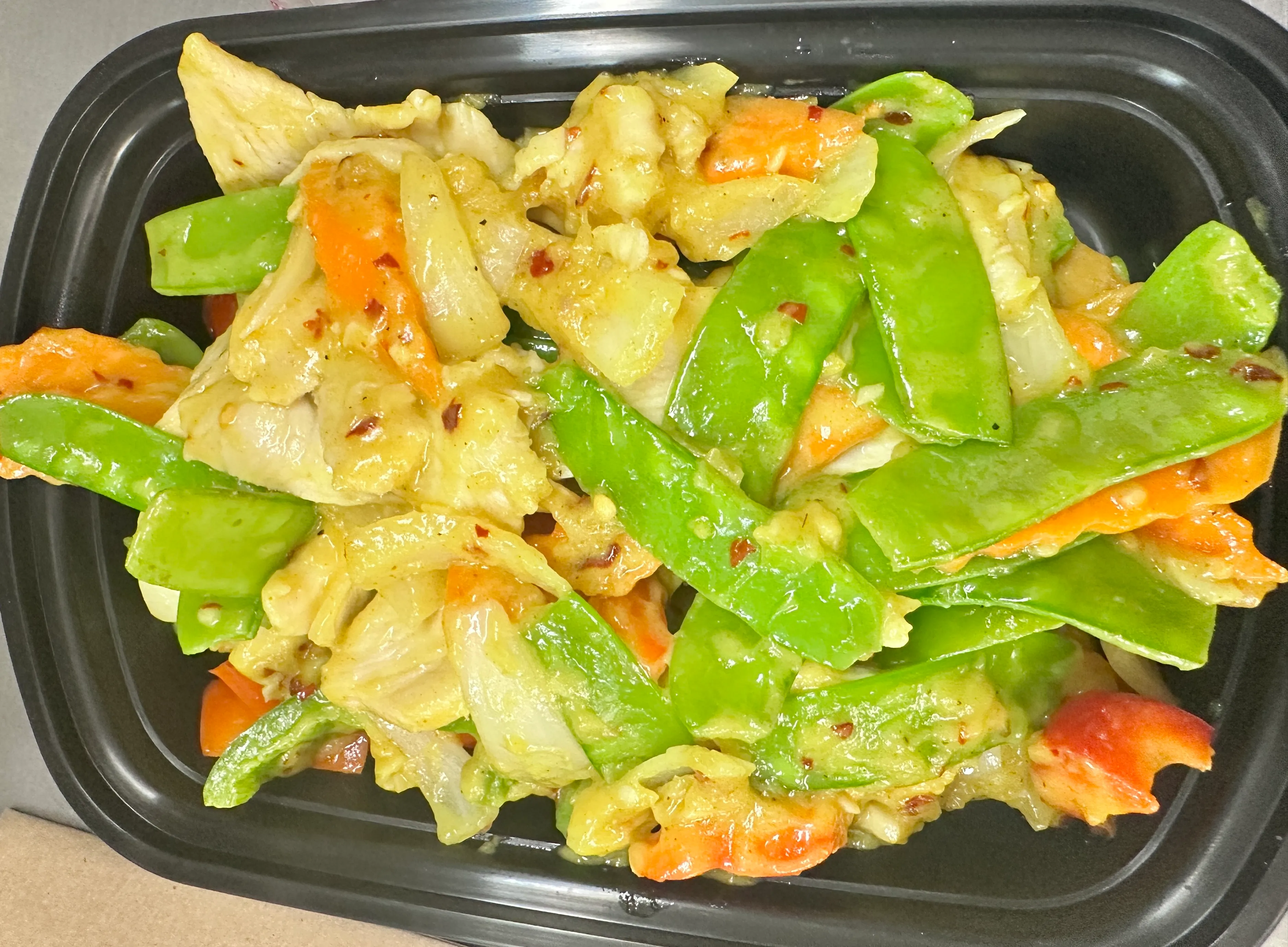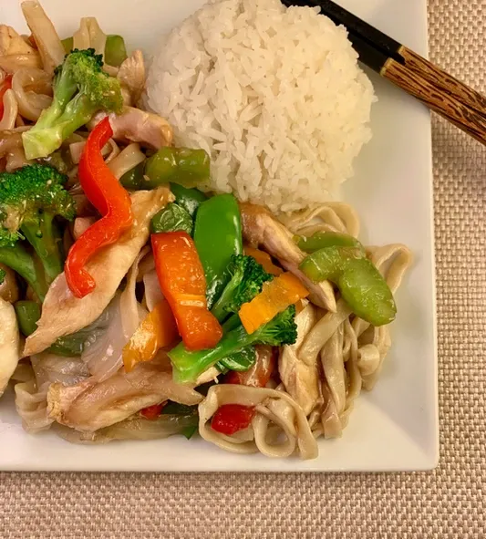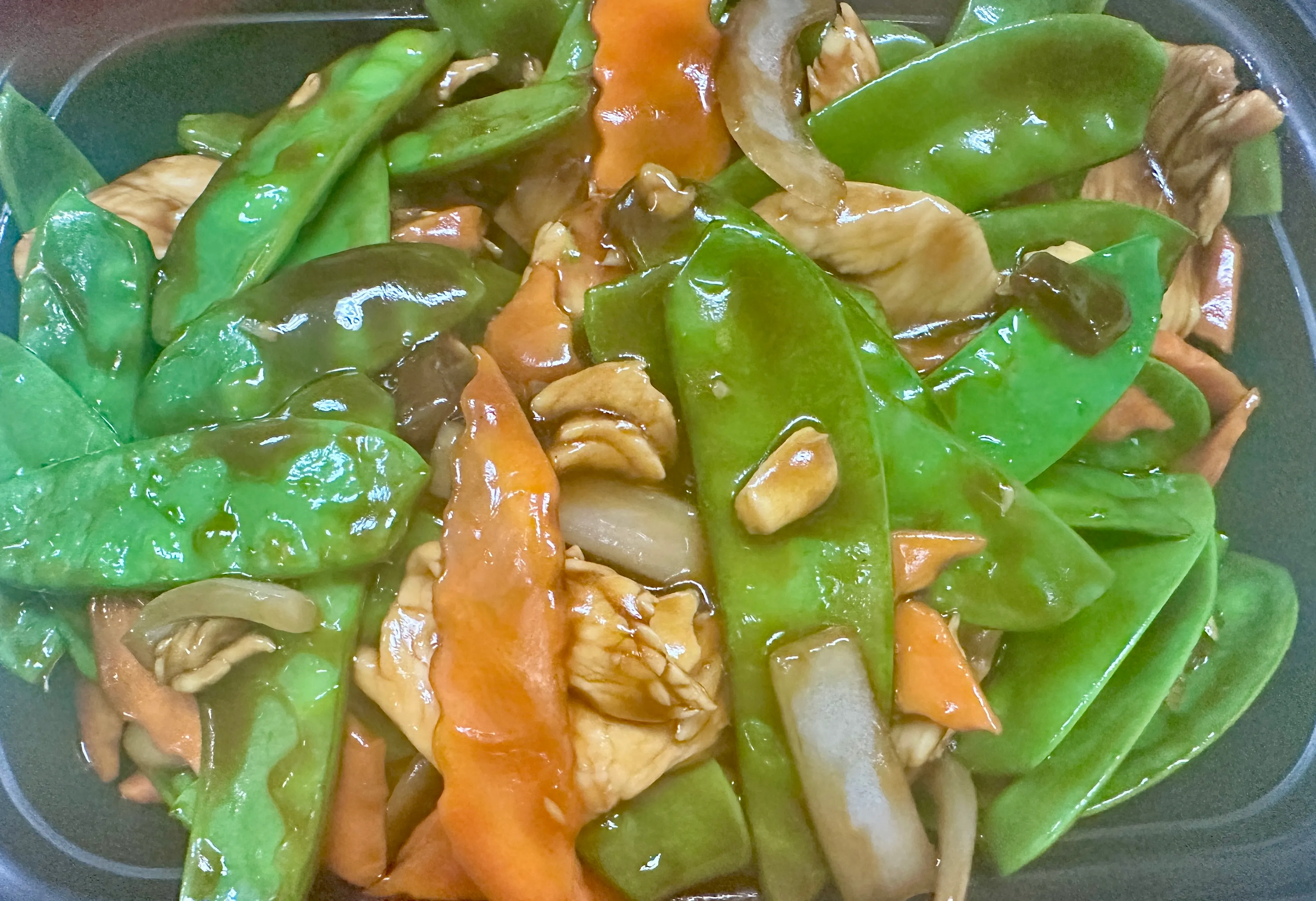 Sliced chicken strips stir fried with peapods, carrots & white onions. Served with white rice.