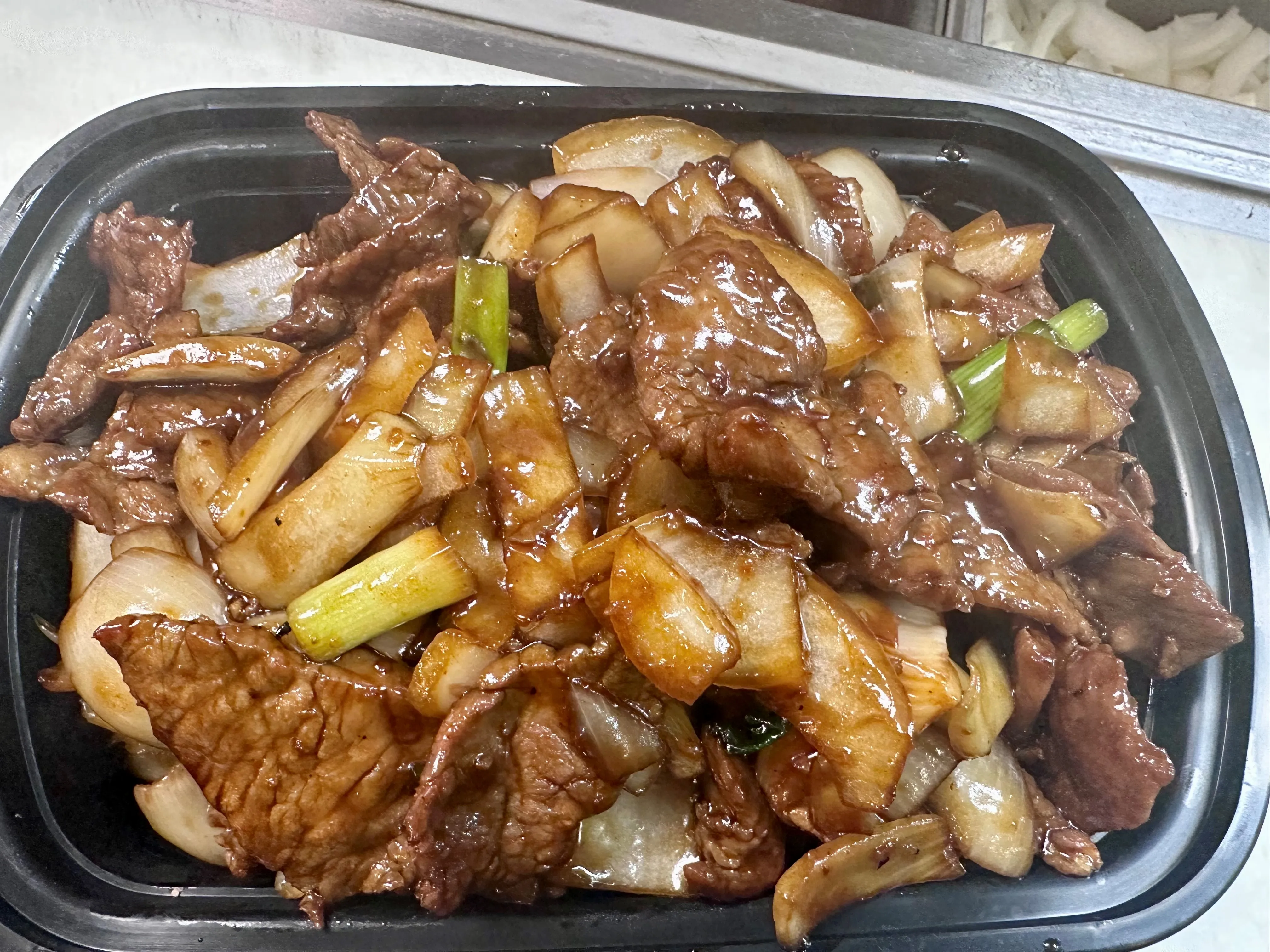 Sliced pork loin stir fried with onions, carrots & mushrooms. Served with white rice.