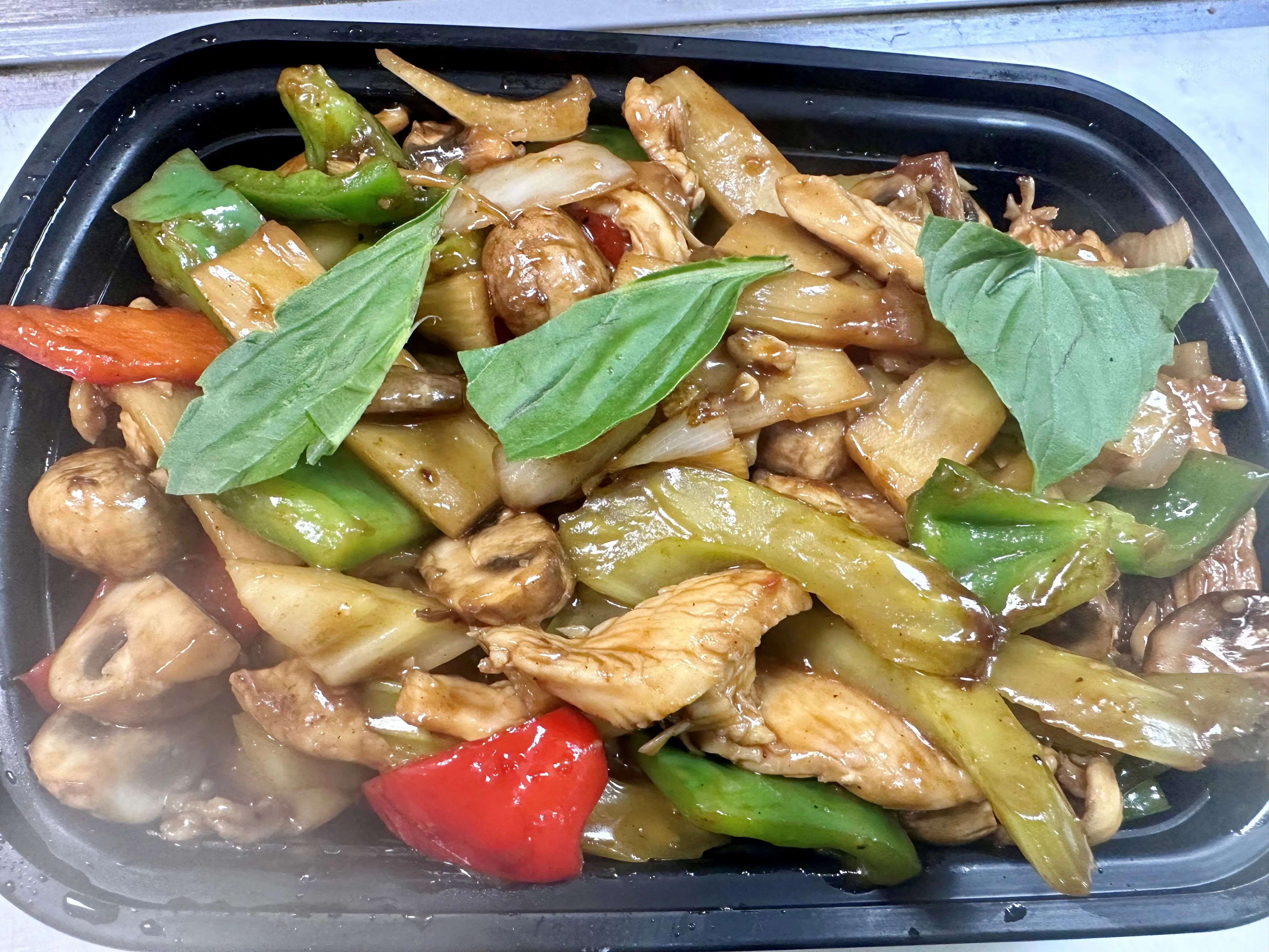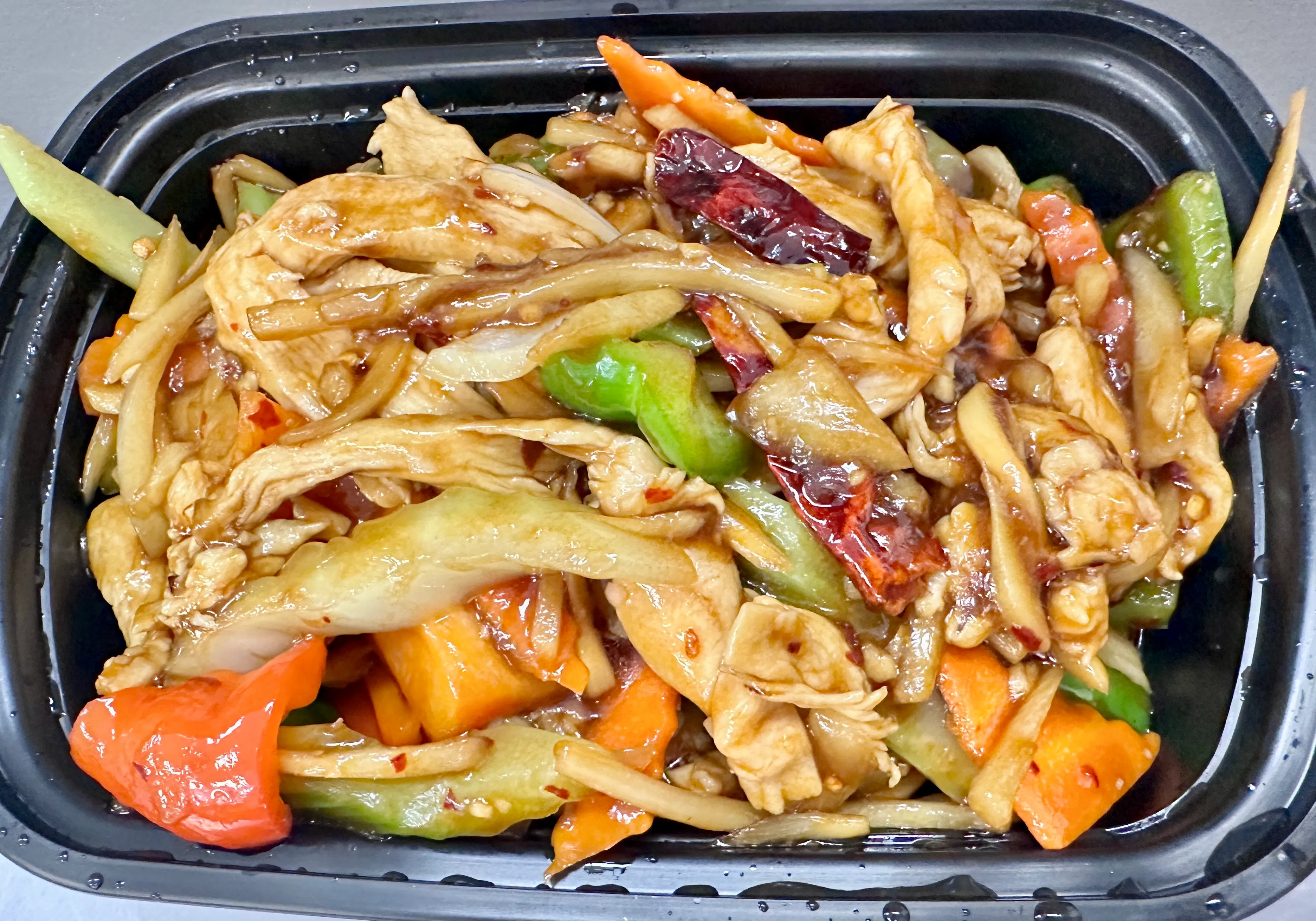 Strips of chicken breast stir fried with bamboo slices, carrots, water chestnut, green or red peppers and onions. Served with white rice.