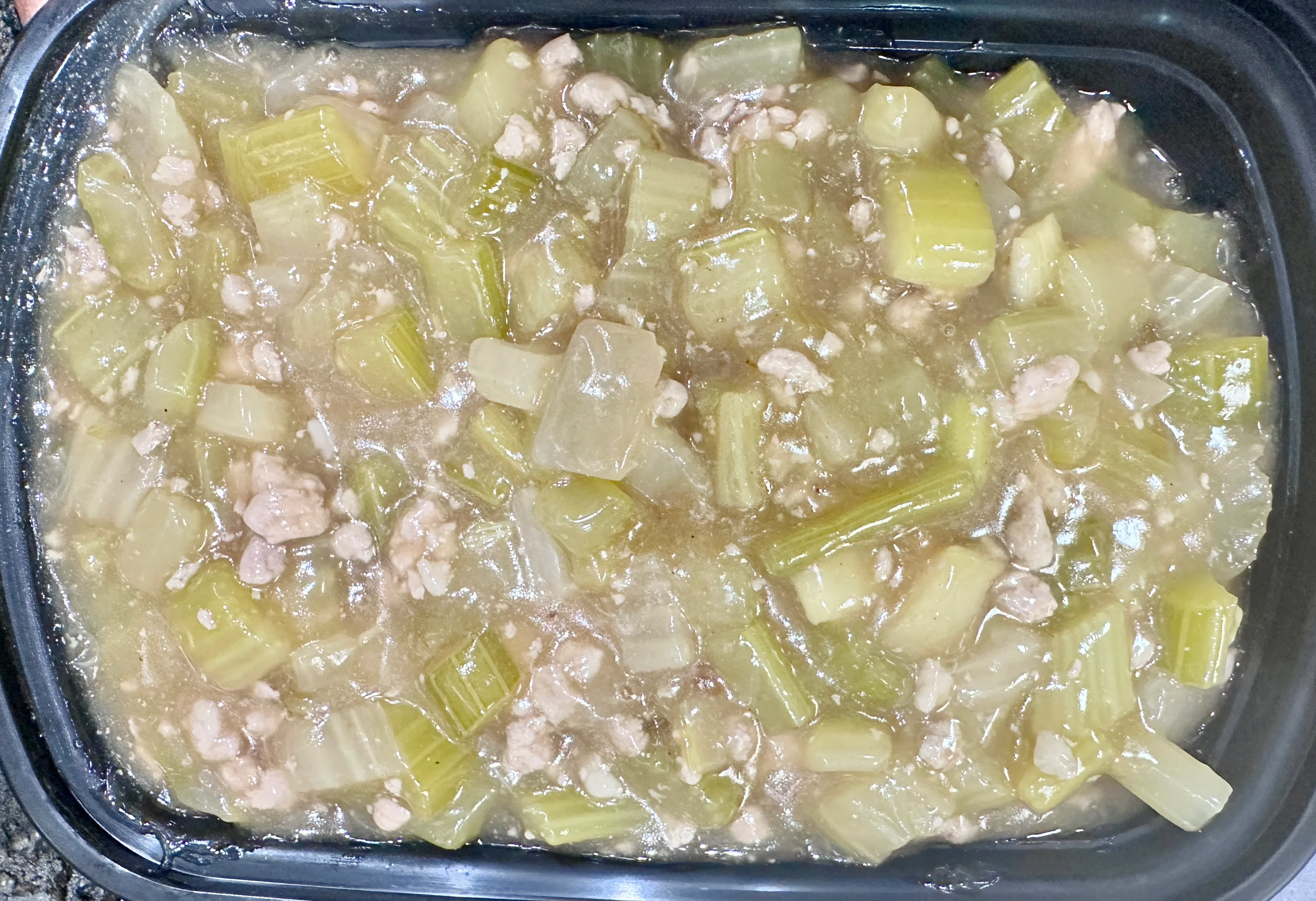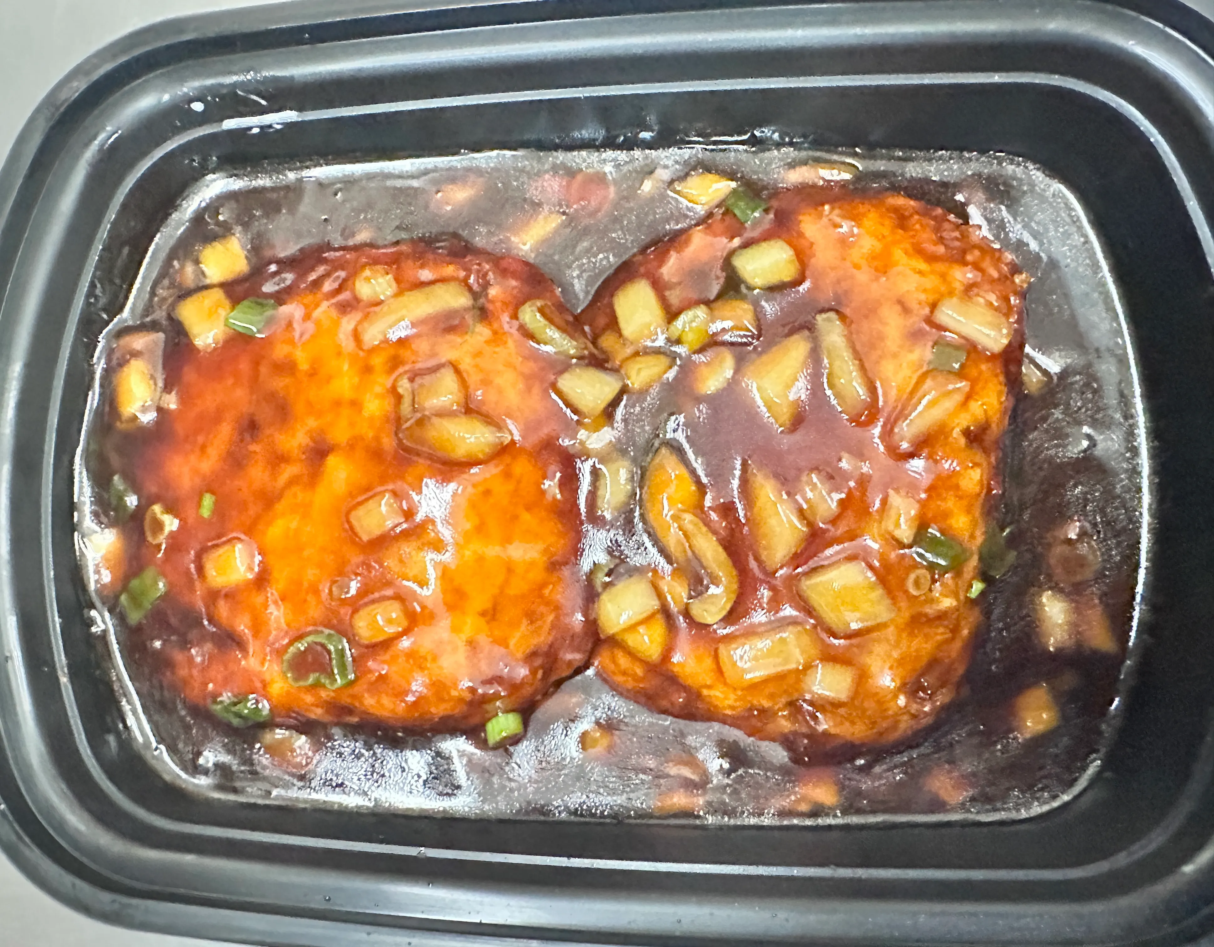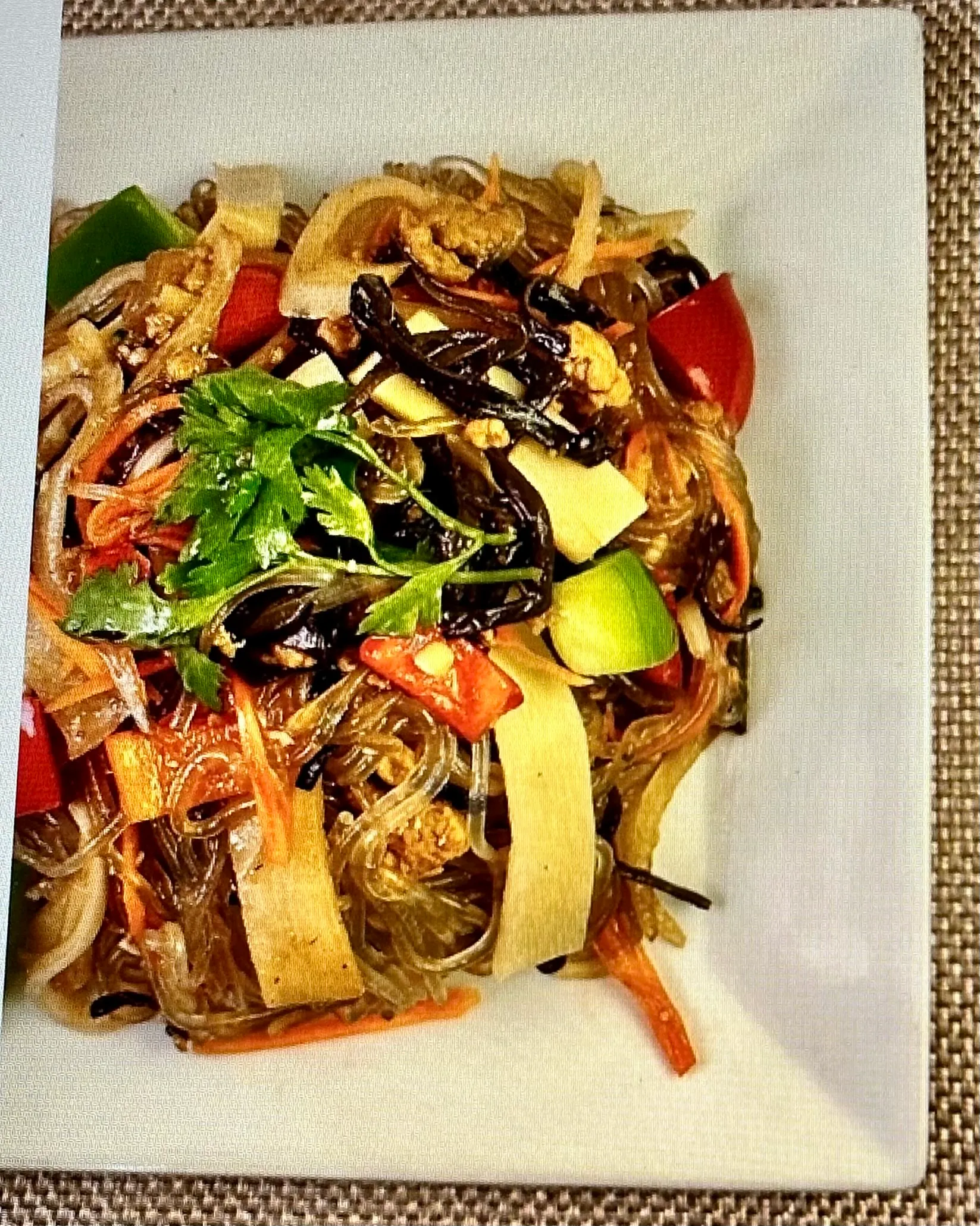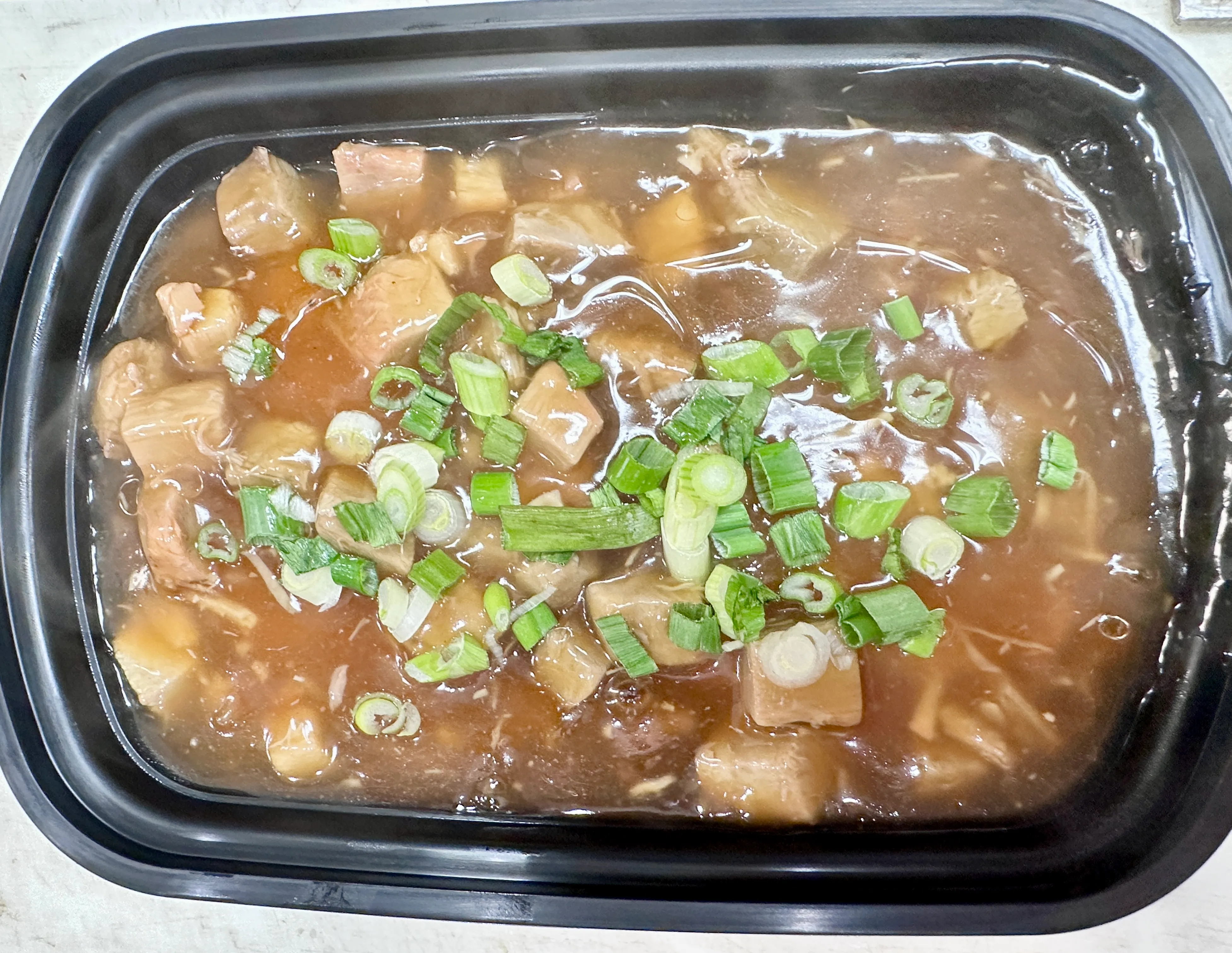 Organic tofu, dried mushrooms ears, bamboo strips, BBQ pork cooked in chicken stock mixed with eggs and various seasonings