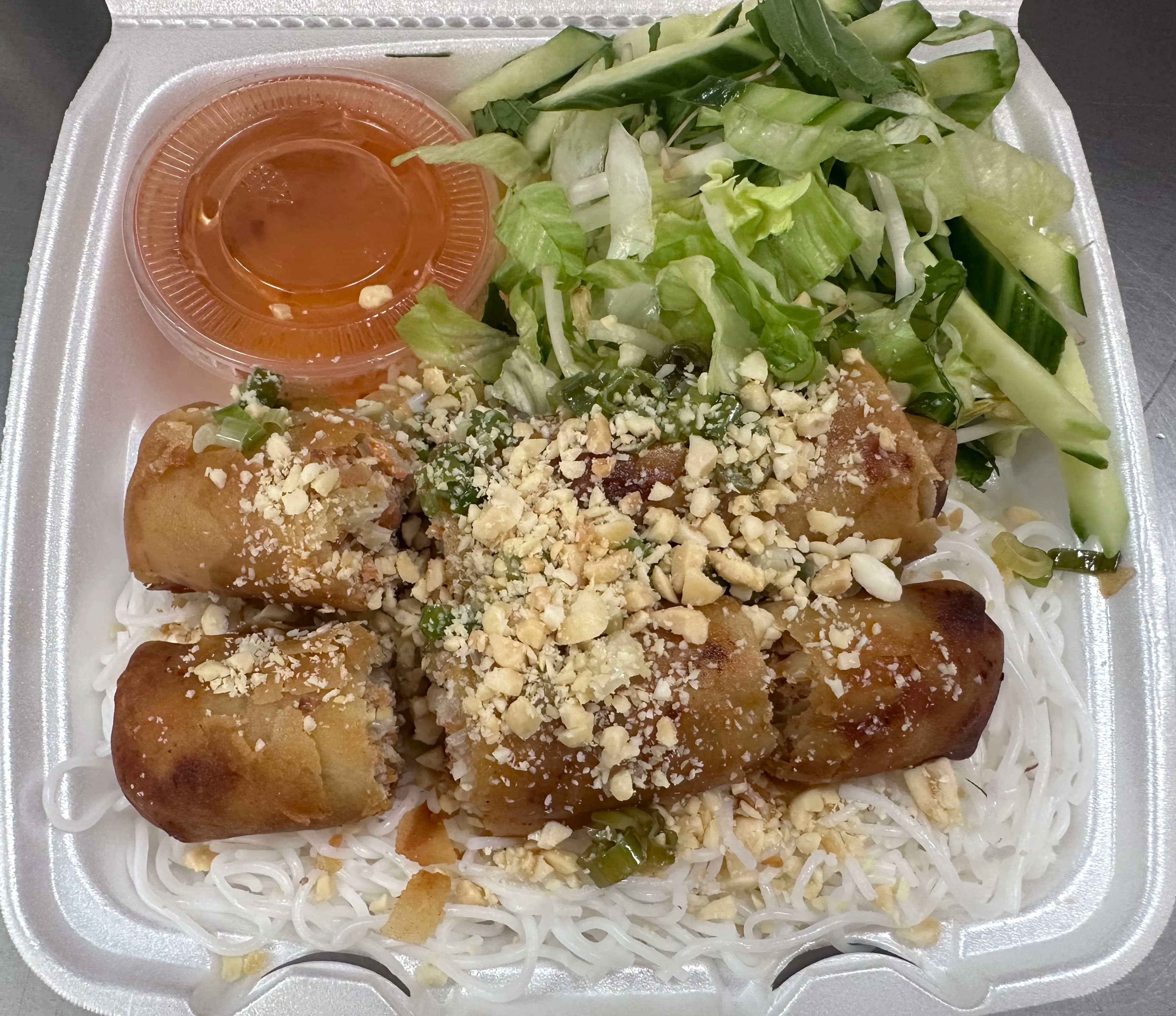 2 pieces. Lettuce, mint, and vermicelli noodle wrapped in rice paper. Served soft with homemade peanut sauce and topped with crushed peanuts.