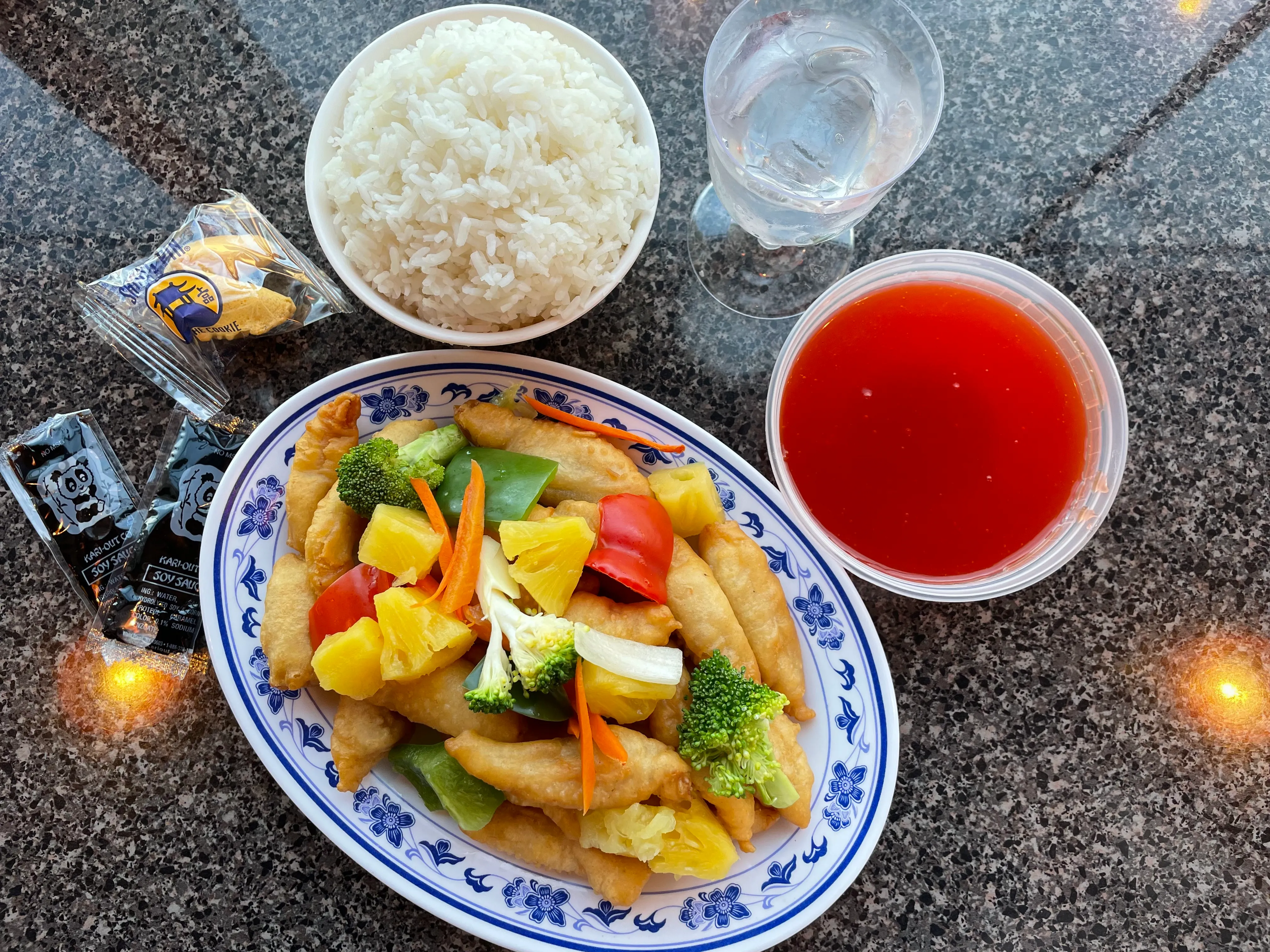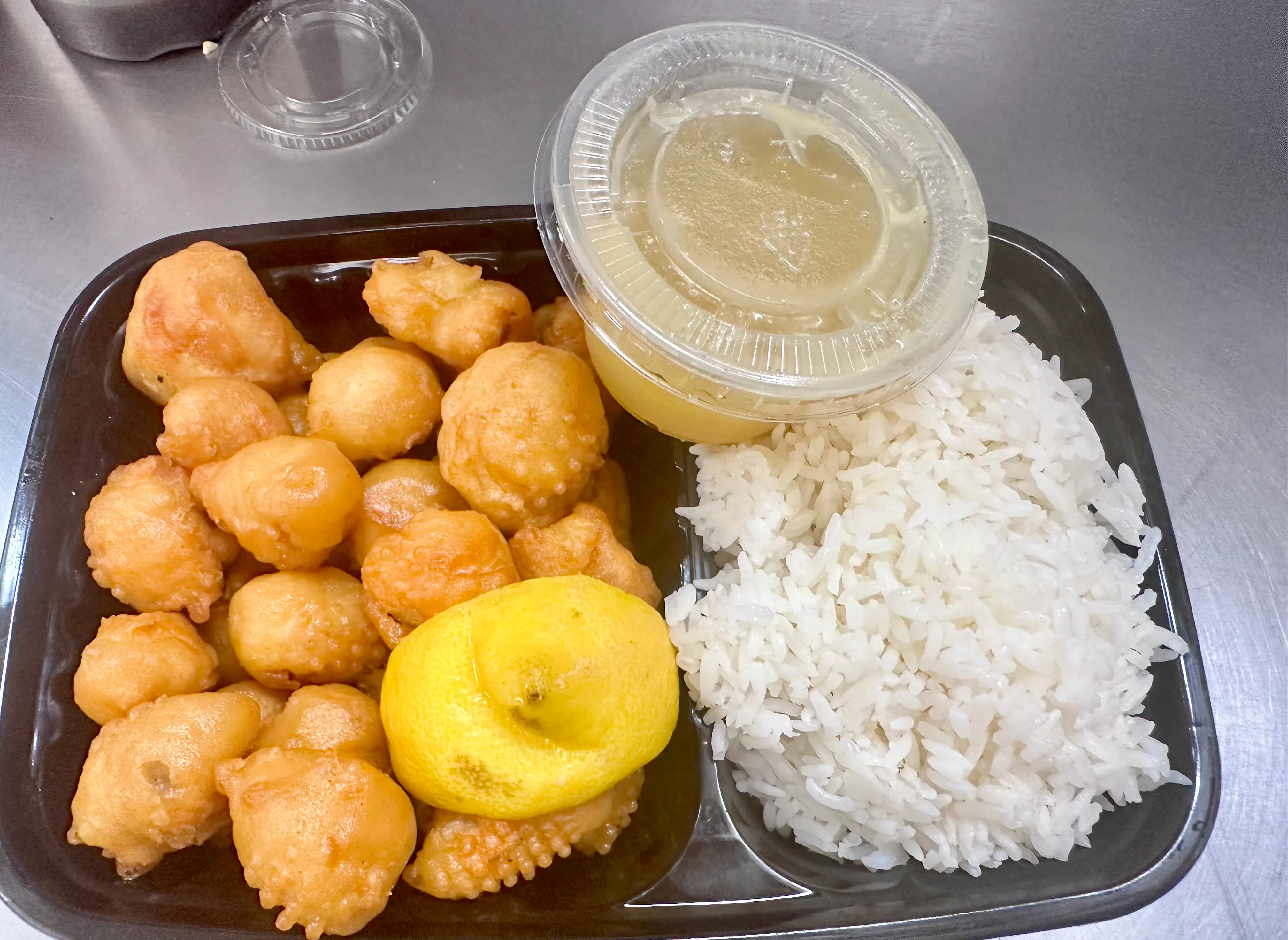 Chunks of marinated chicken breast dipped in seasoned batter and fried to golden crisp and served with special house lemon sauce and white rice.