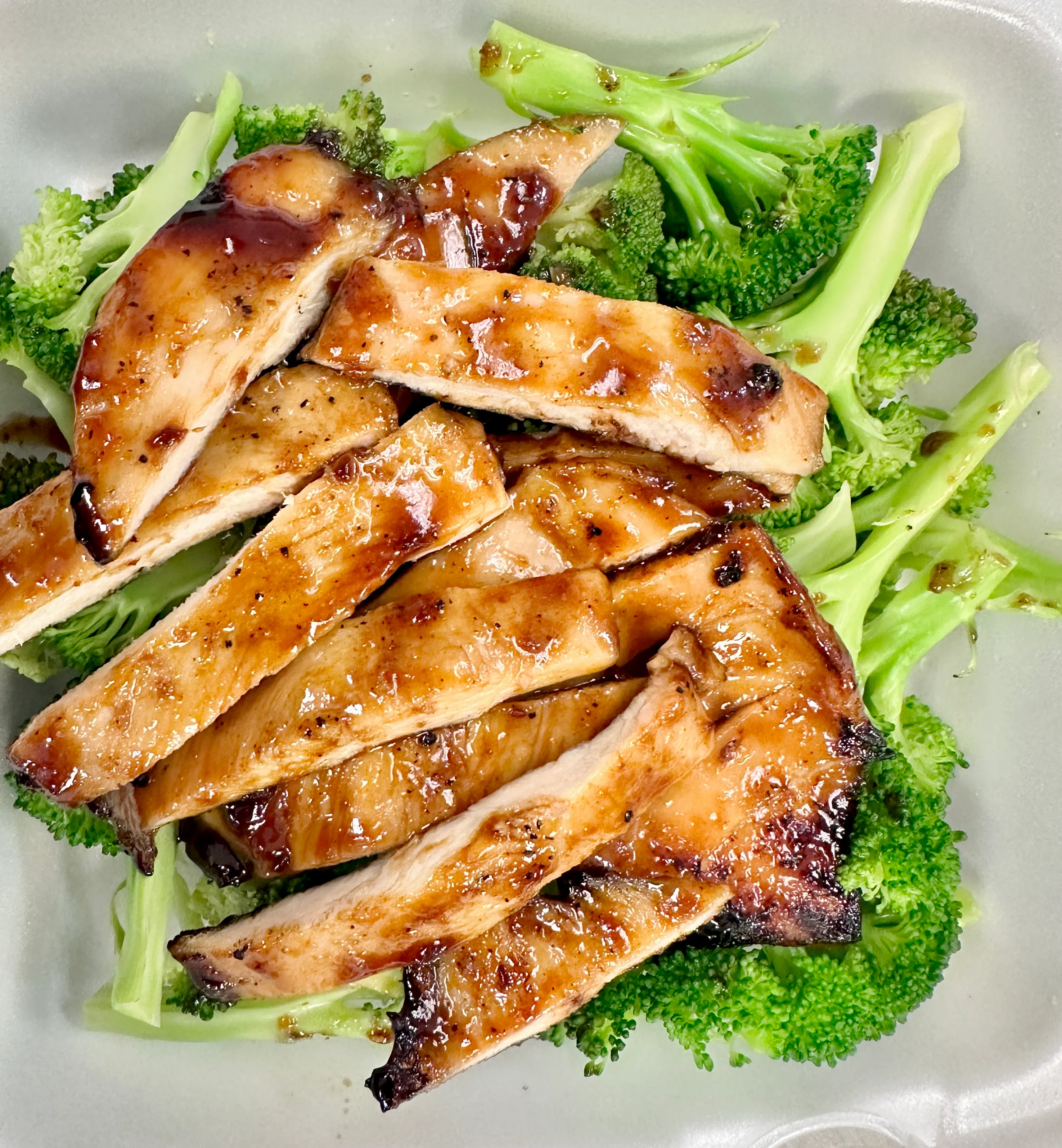 Grilled chicken marinated with our special ginger glaze, served with steamed broccoli and white rice.