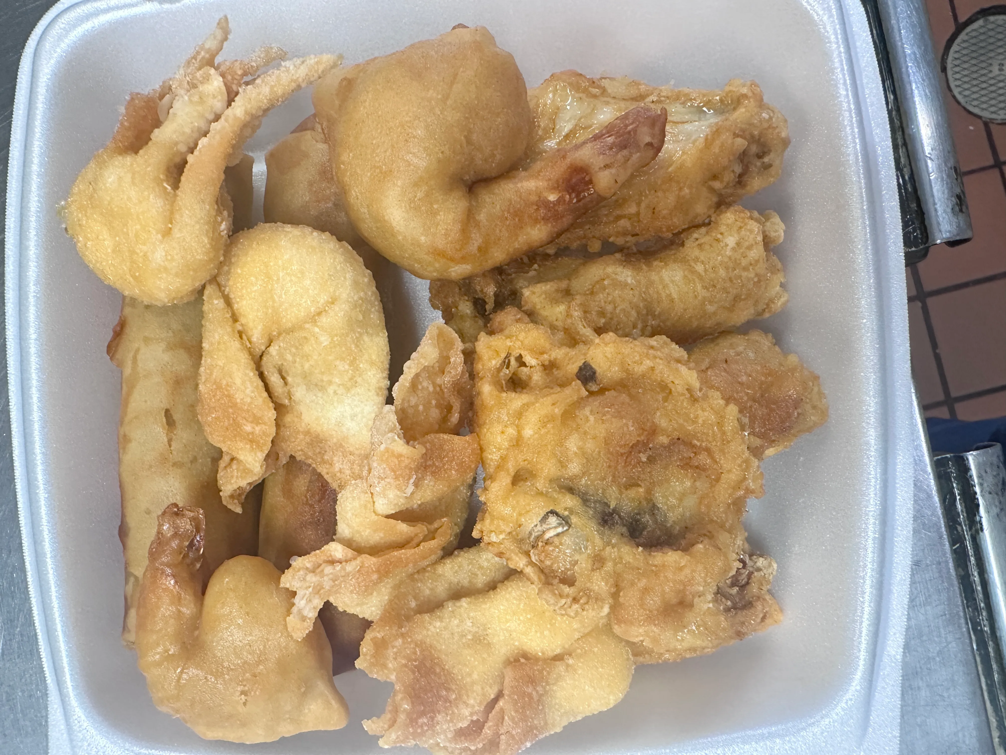 (2) Egg rolls pork OR (2) chicken, OR (2) veggie, (4) Fried chicken wings. (2) Golden fried shrimp, (4) Cream cheese wontons. No substitutions please.
