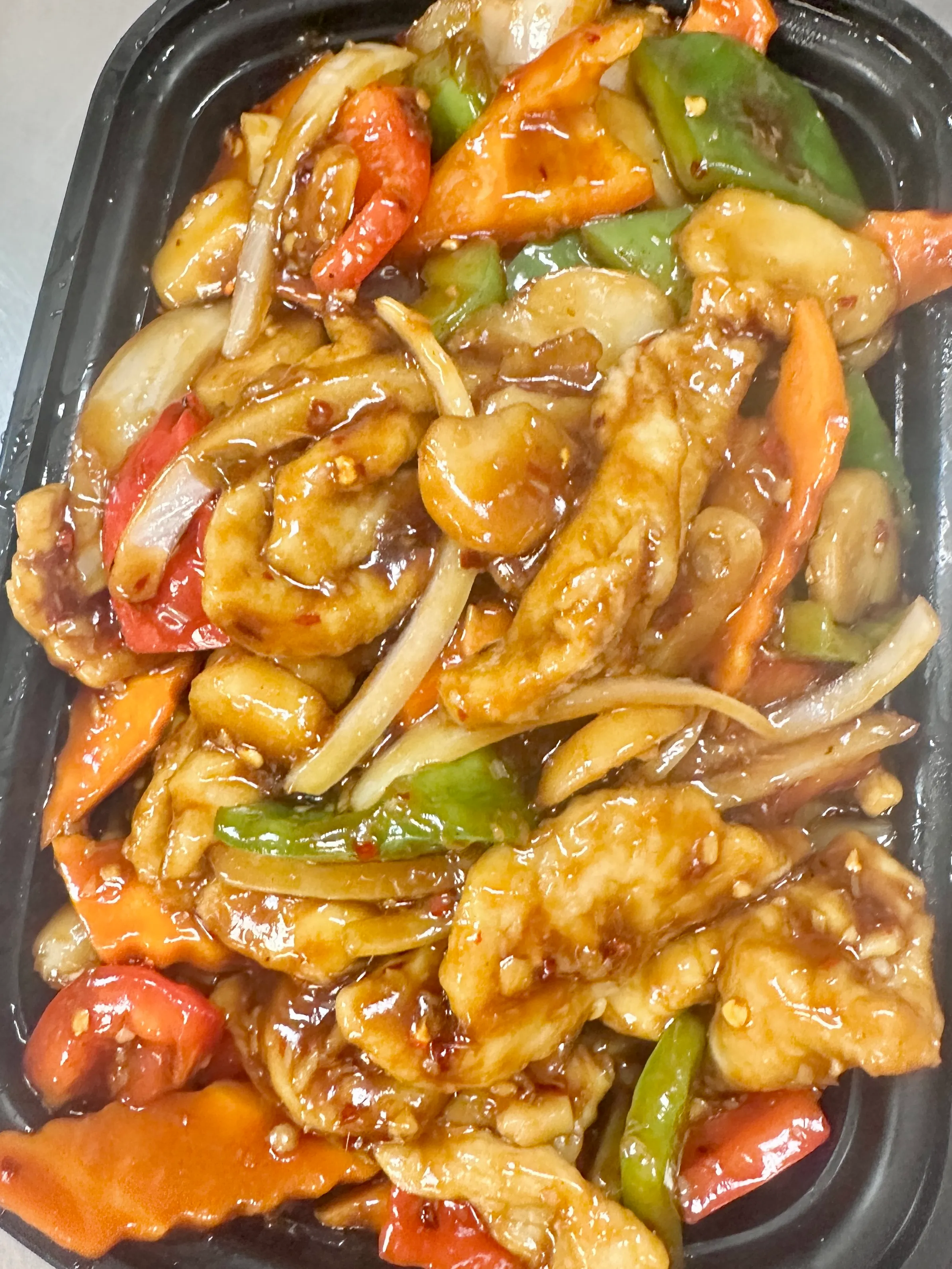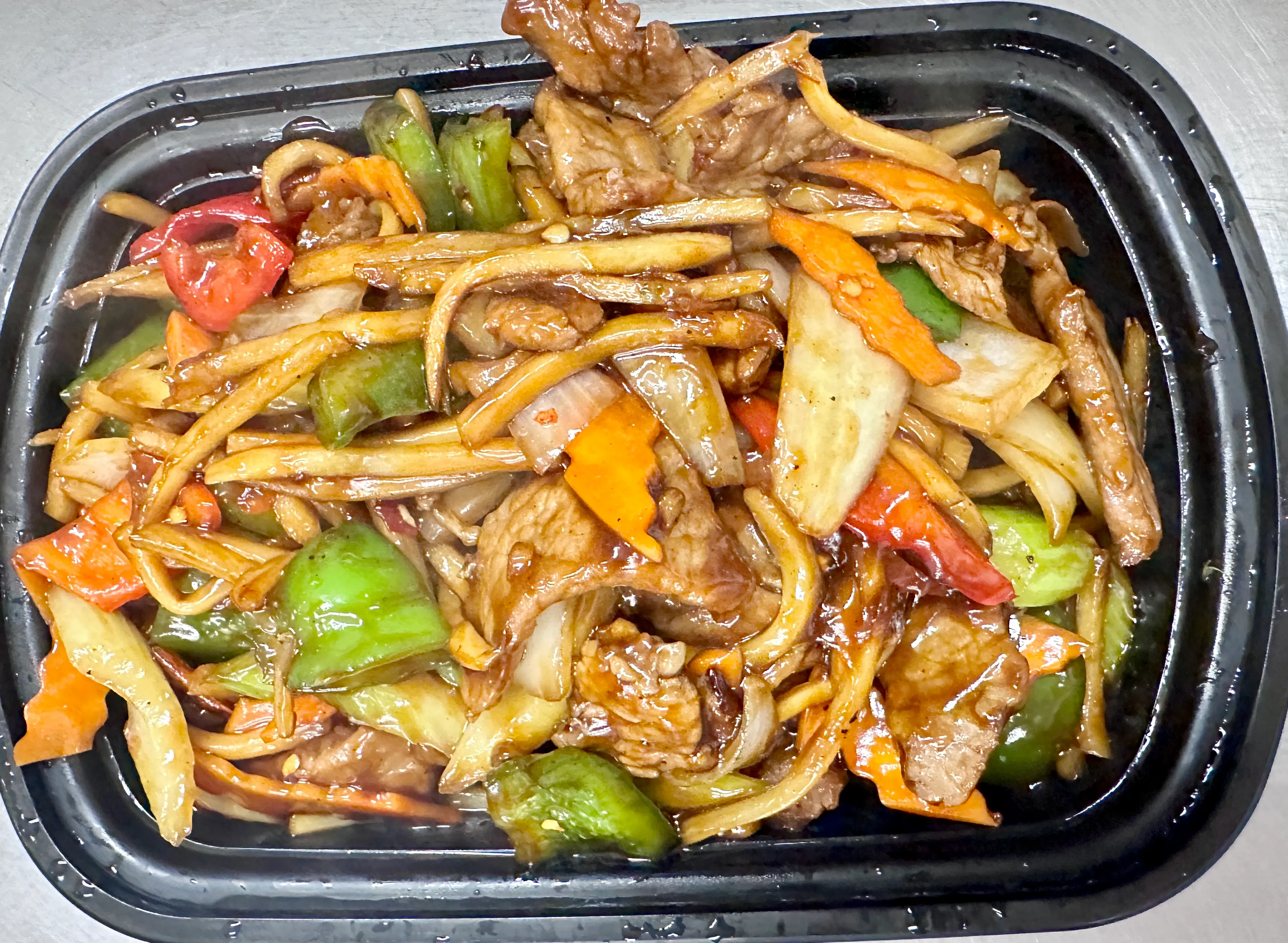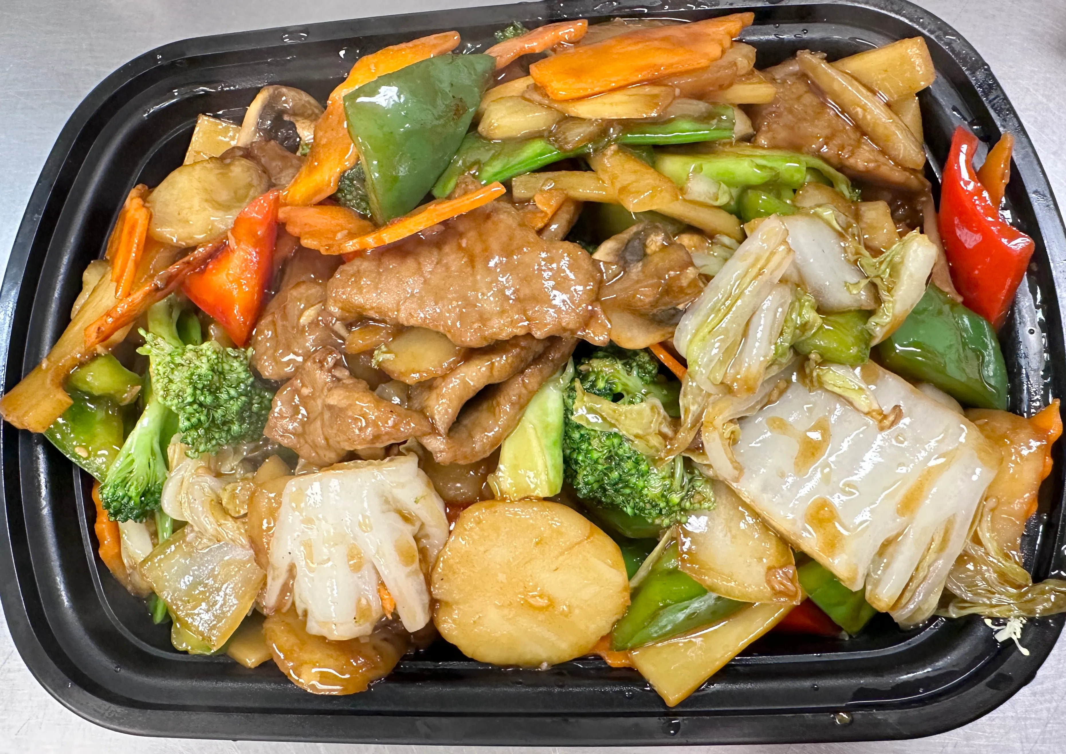 Sliced pork stir fried with bamboo slice, carrots, water chestnut, red & green pepper and onion. Served with white rice.