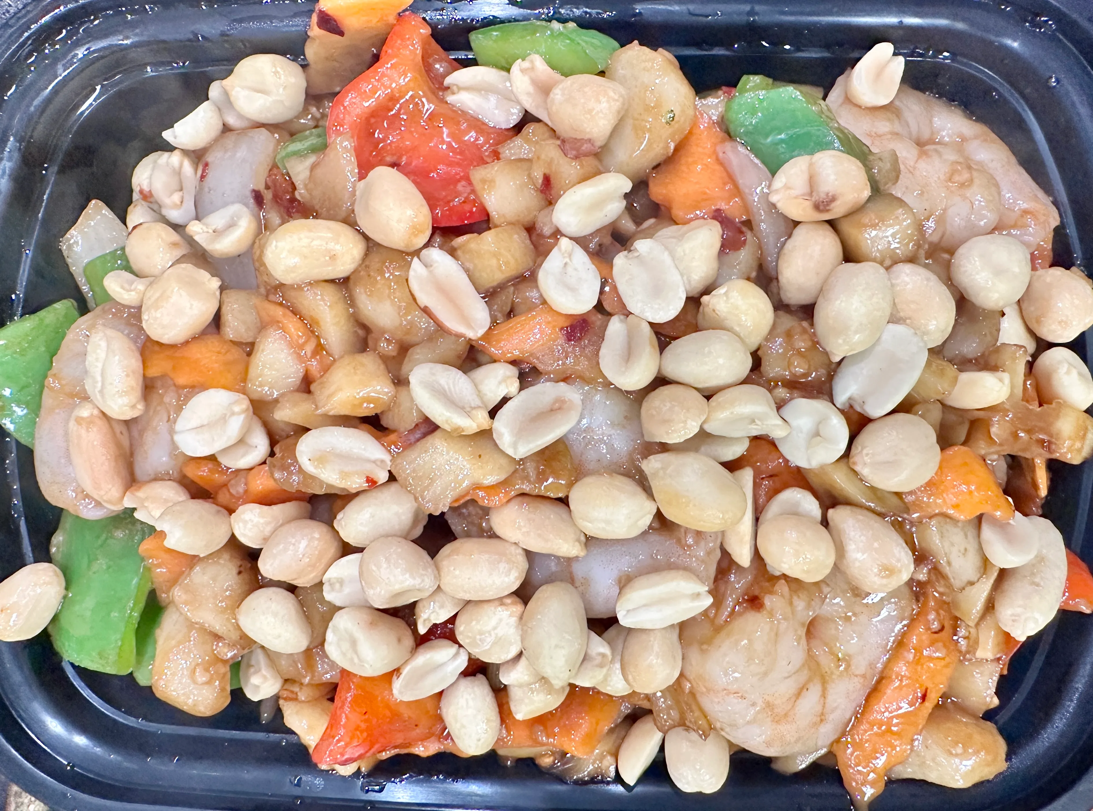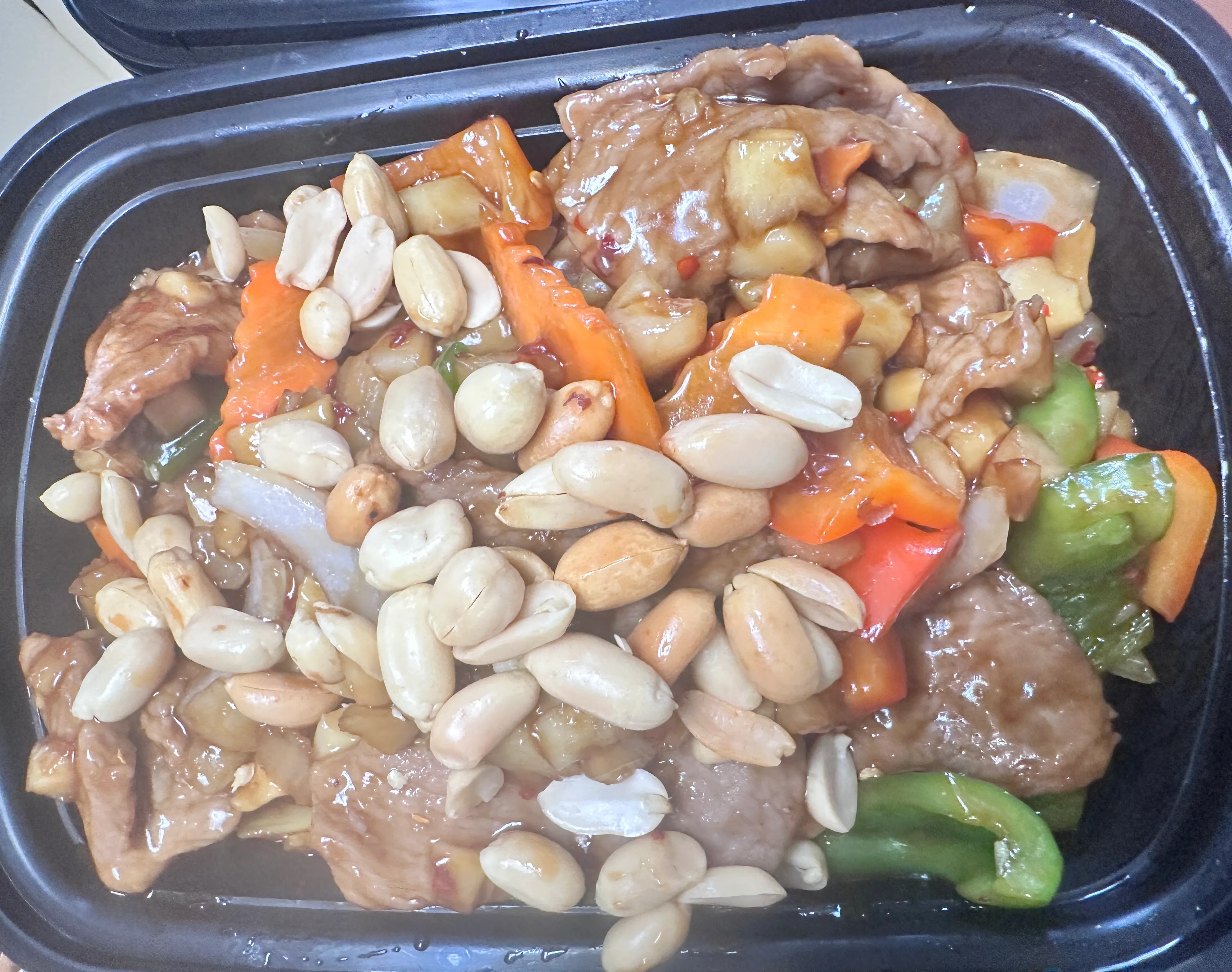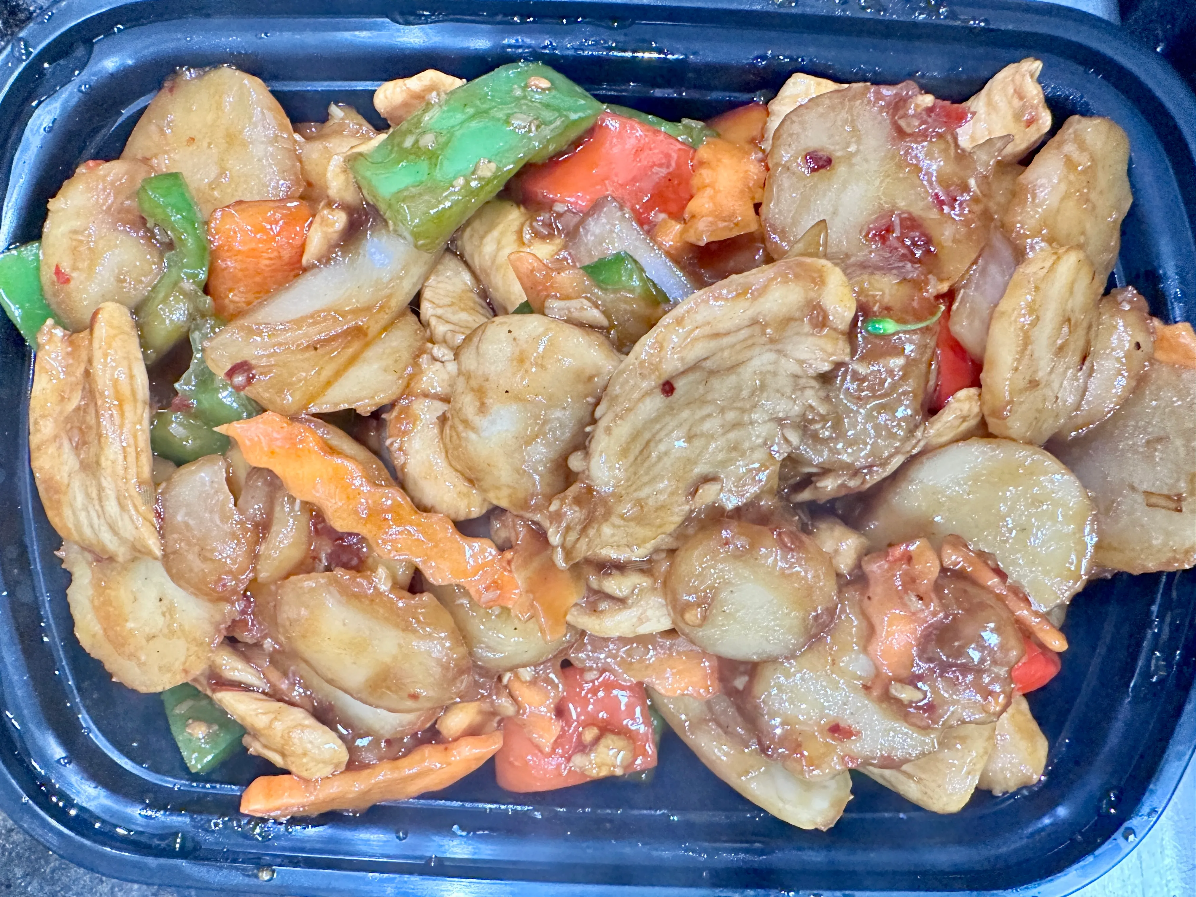 Sliced pork stir fried with bamboo slice, carrots, water chestnut, red & green pepper and onion. Served with white rice.