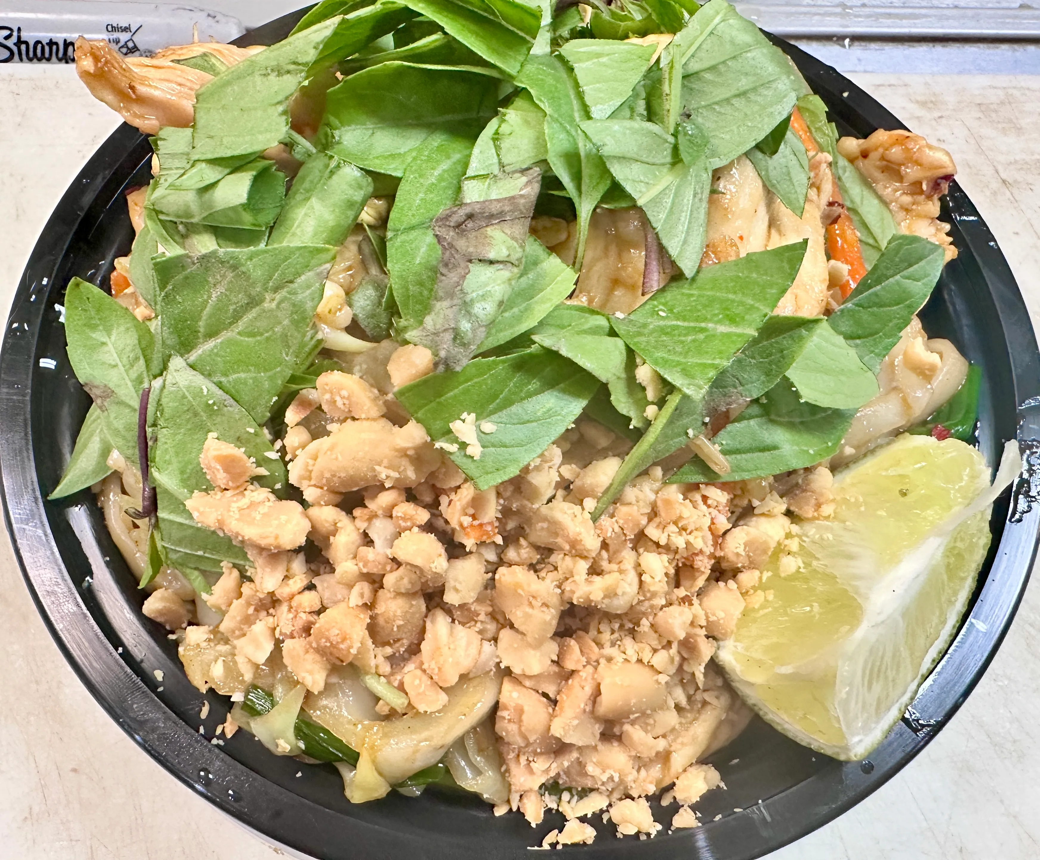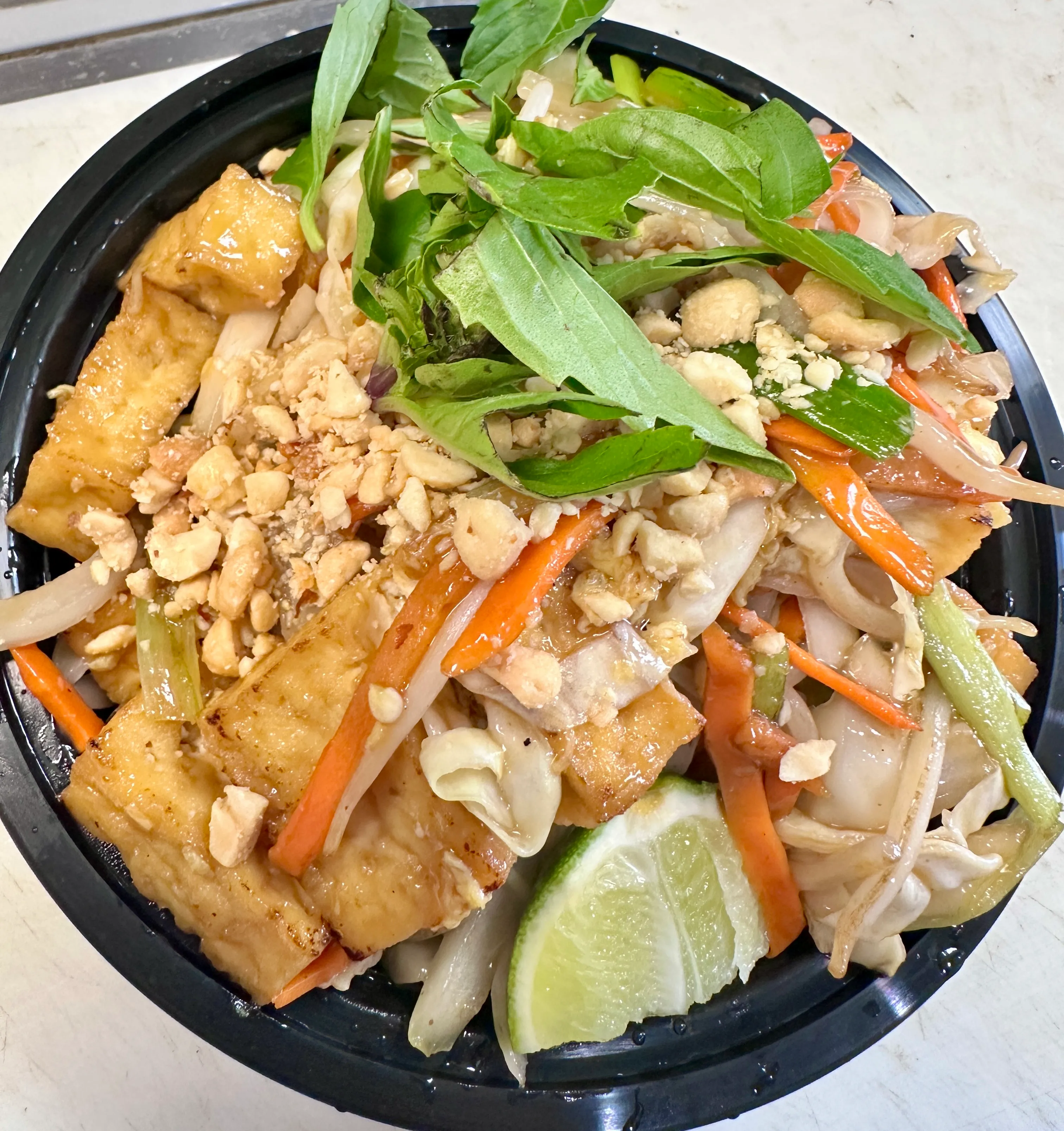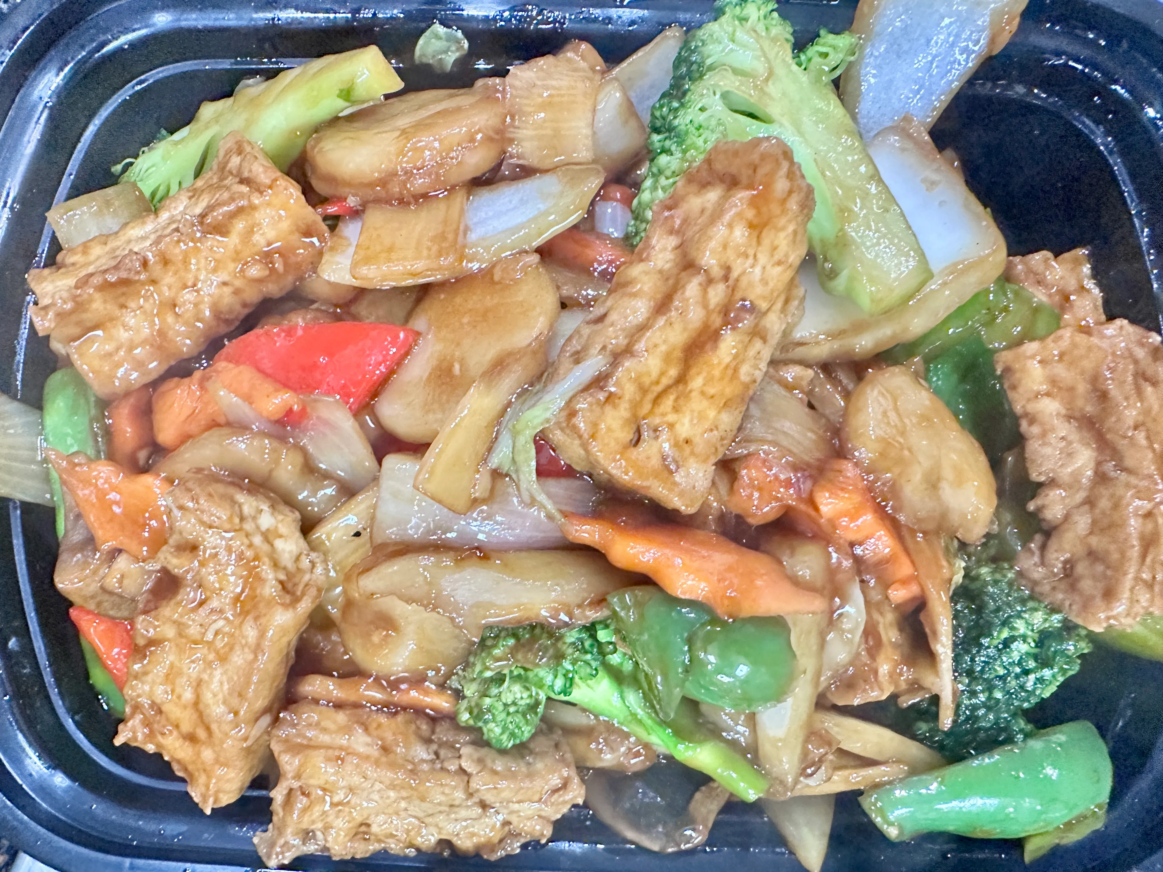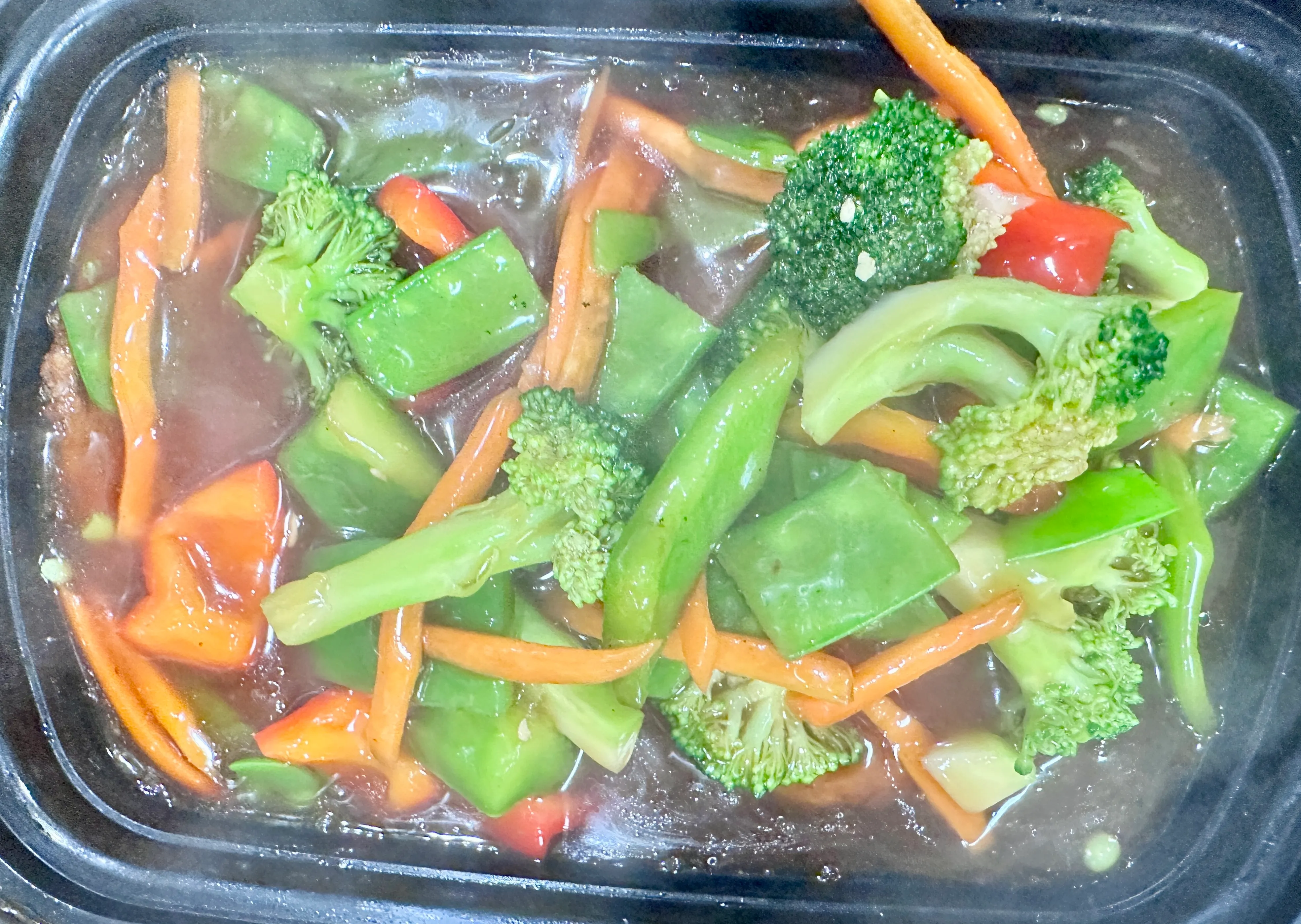 16 Oz cup. Broccoli, carrots, red/green bell peppers, napa cabbage, mushrooms, bamboo slices, water chestnut slices, peapods.