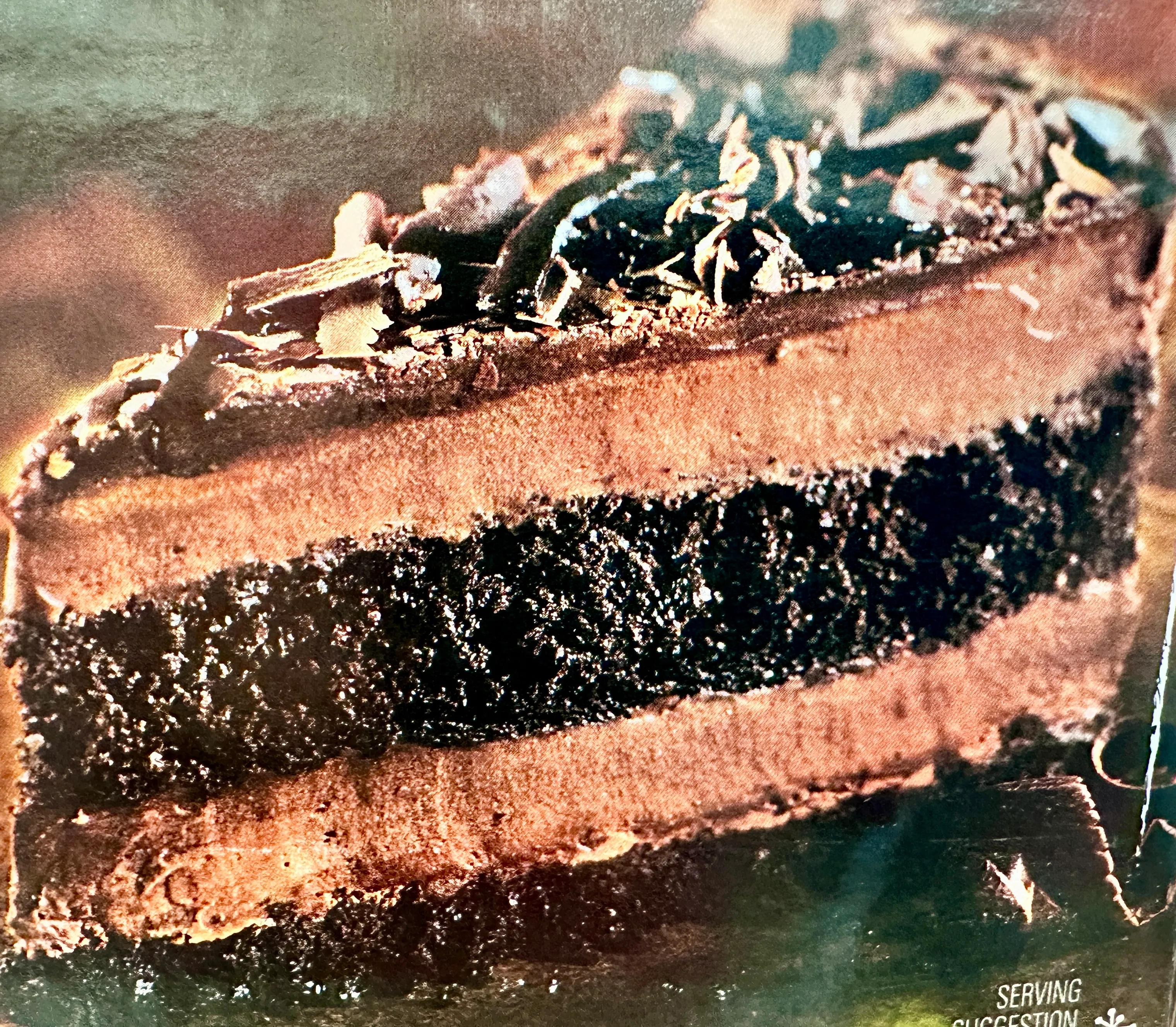 Layer of chocolate cake and chocolate mousse are topped with dark chocolate ganache and finished with a generous sprinkling of chocolate shavings.