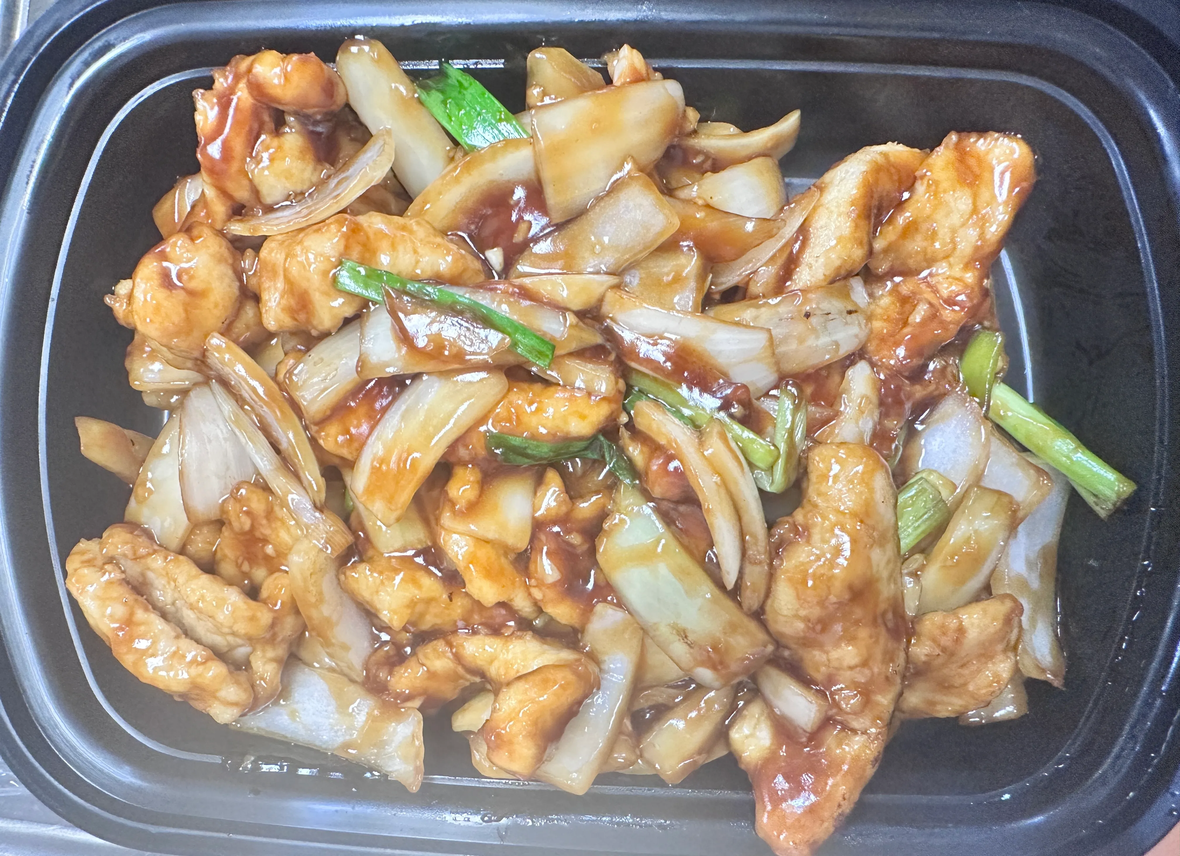 (Original) Strips of chicken stir fried with onions, lemongrass and sweet and spicy caramelized sauce. Served with white rice.
